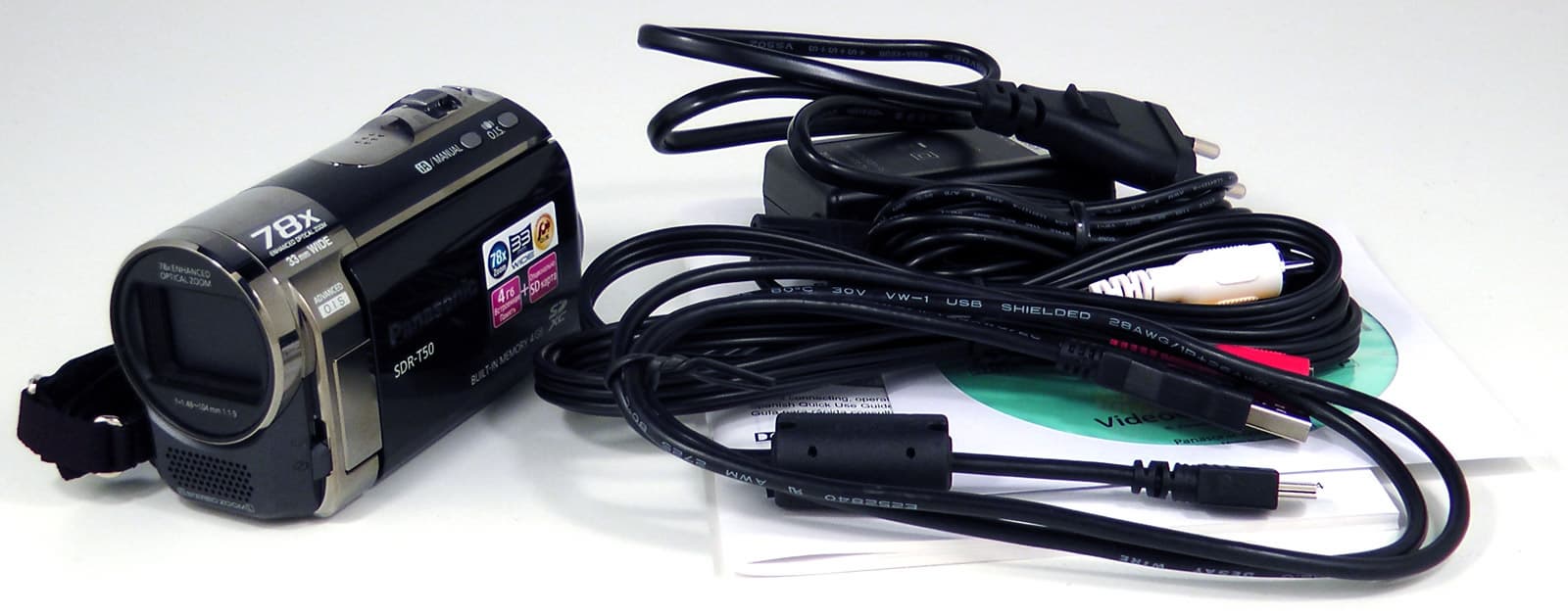 Комплектность аппарата более чем скромная: блок питания, инструкция, компакт-диск с программным обеспечением и PDF-инструкцией к нему, кабель USB и композитный аудио-видеокабель.