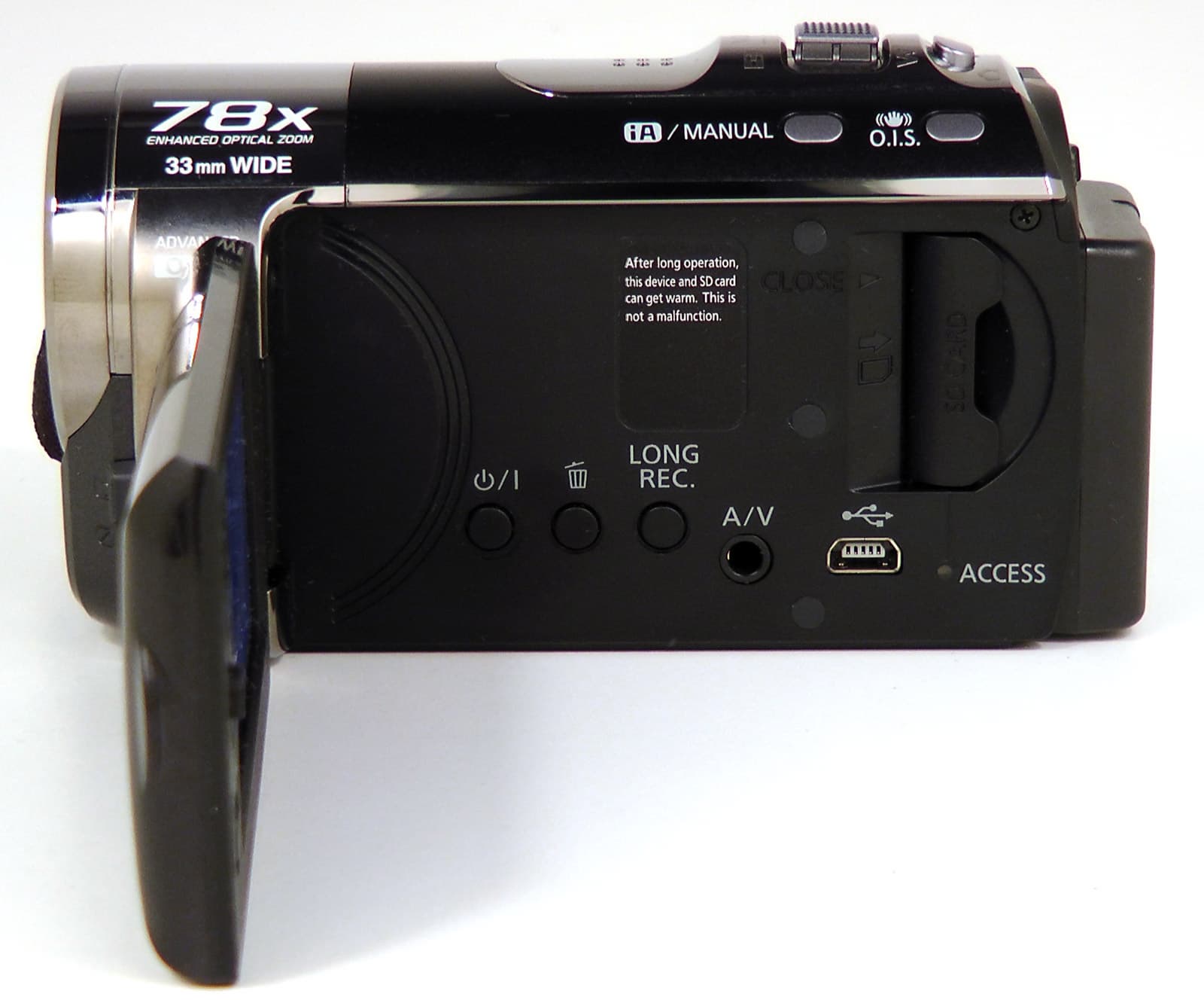 Под ЖК-экраном находятся: кнопка принудительного включения/отключения видеокамеры; кнопка удаления файлов в режиме плеера, кнопка LONG REC., активирующая режим съёмки в формате AVC, композитный аудио-видеовыход и порт USB.
