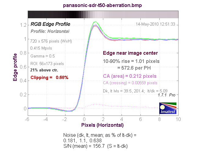 График хроматической аберрации (на самом деле, это тот же краевой профиль, только построенный по каждому цвету в отдельности). При значении параметра CA (area) равным 0-0.5 хроматическая аберрация не заметна.