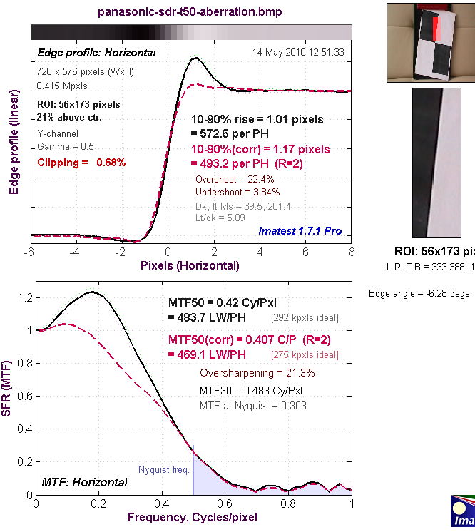 Верхний график представляет собой краевой профиль, для которого приведено значение 10-90% rise distance в пикселях, а нижний график представляет собой MTF (Modular Transfer Function — функция передачи модуляции), для которой приведен параметр MTF50 в циклах на пиксель. Краевой профиль и MTF камеры показаны черной линией. Красной пунктирной линией обозначен краевой профиль и MTF, которые программа Imatest считает близкими к оптимальным. 10-90% rise distance и MTF50 также являются расчетными величинами Imatest.