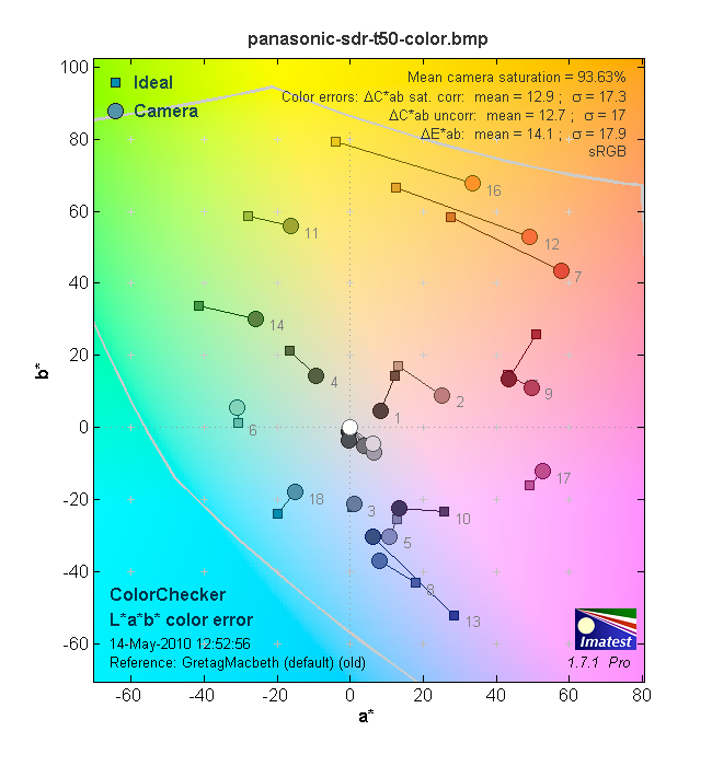На следующей диаграмме в графической форме представлены отклонения зарегистрированных камерой цветов от идеала в цветовом пространстве CIE LAB. Данная диаграмма отклонения в Lab показывает на сколько камера дает ошибку при передаче цвета.