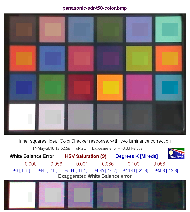 Средняя строчка цифр показывает нам численную оценку ошибки баланса белого в единицах цветового пространства HSV. Так, цифры красного цвета обозначают ошибку по координате S — saturation (насыщенность), цифры синего цвета — в градусах Кельвина [Миредах (Mireds)]. При значении S < 0.02 (речь идет об ошибке по координате S в HSV), ошибка практически незаметна, а при ошибке S > 0.10 она видна, особенно на нейтральных полях большой яркости.