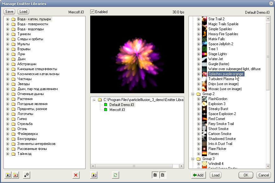 В этом менеджере разобраться проще простого: в центре видимо окно с выбором существующих на диске библиотек, справа раскрывается их содержимое, в левом же окне происходит создание новой библиотеки путем редактирования папок и импорта в них выбранных эмиттеров. Нужно иметь в виду, что создание и загрузка библиотеки с большим количеством эмиттеров может сильно замедлить время запуска программы, особенно на слабых машинах. Порочный пример такой мега-библиотеки показан на рисунке.