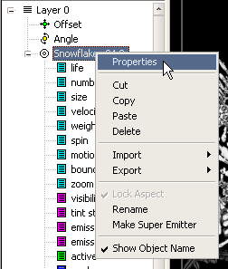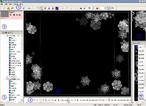 После того, как вы разобрались с библиотеками, и вышли из менеджера, выделите в окне библиотеки (6) нужный эмиттер мышью, и в окне просмотра (7) сразу увидите его в действии. Переведите курсор мыши на окно проекта (5), убедитесь, что курсор имеет форму окружности с точкой в центре. Щелкните мышью в центре кадра, и в этом окне немедленно появится прямоугольная рамка, заполненная снежинками. Нажмите кнопку Play, и вы увидите, как снежинки появляются, движутся, вращаются и тают. Теперь верните курсор (4) в начальное положение, в окне иерархии (3) щелкните правой кнопкой мыши по названию эмиттера и выберите пункт Properties.