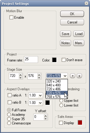 При запуске программы создается пустой проект с параметрами по умолчанию, изменяемыми в настройках. Поскольку мы хотим украсить видео, скорее всего, имеющее разрешение 720х576 и частоту 25 кадров в секунду (PAL), нужно изменить параметры проекта. Для этого служит кнопка