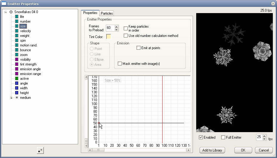 Дело в том, что размер снежинок в этом примере слишком велик для нашего проекта, более того мы хотим сделать снежную рамку, окаймляющую наше видео, а не замостить весь экран гигантскими ледяными кристаллами. Здесь-то и начинаются те самые скрытые на первый взгляд возможности, предоставляемые программой. Пусть теперь вас не пугает масса настроек, находящаяся в открывшемся окне Emitter Properties. Действительно, с их помощью можно изменить редактируемый эффект настолько, что его и собственный создатель не узнает. Но сейчас нам необходимо лишь изменить размер эмиттера (в данном случае прямоугольной области, заполненной снежинками), да размер самих снежинок.