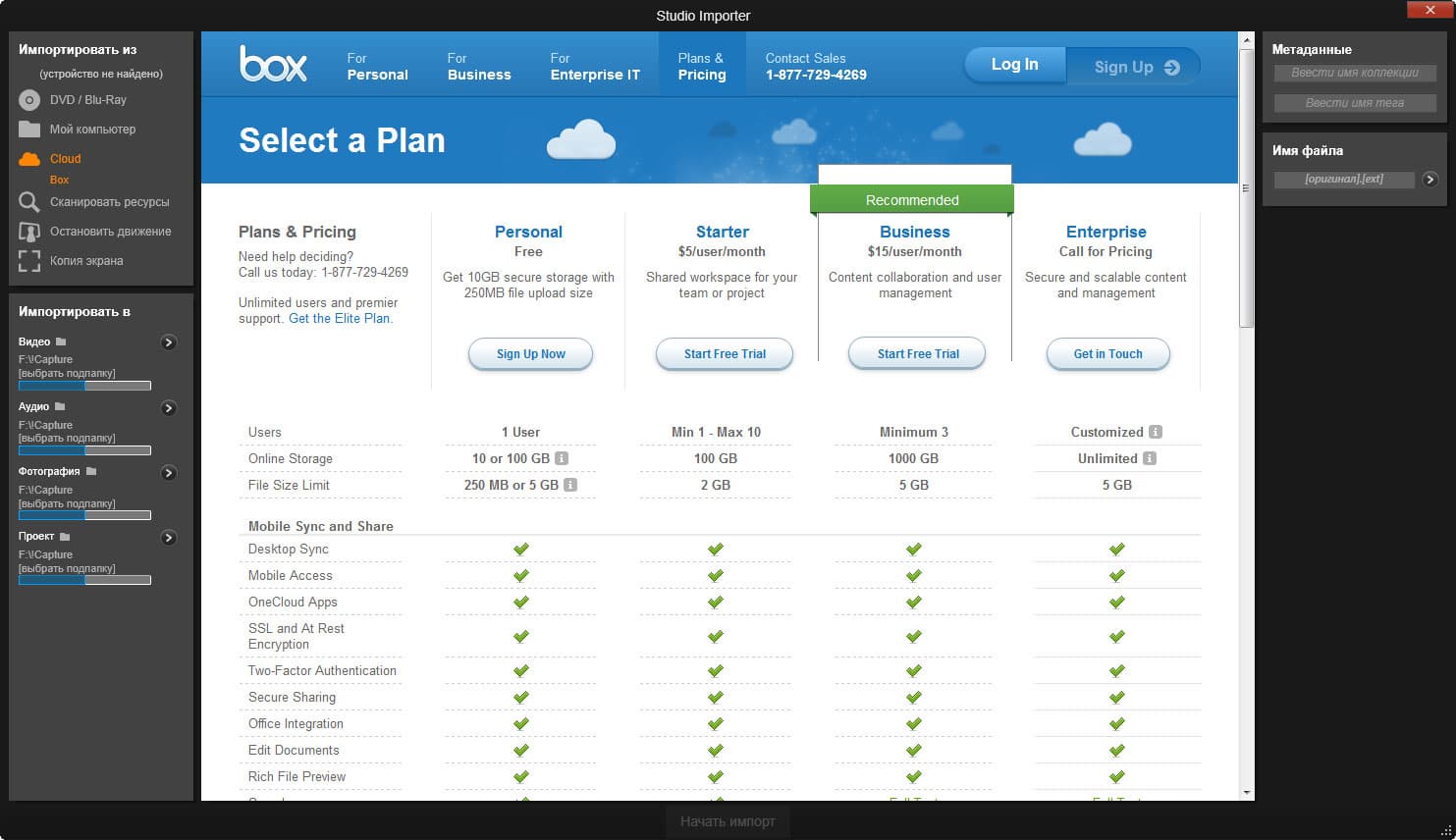 Но мы все же заглянули в этот модуль импорта. Помимо таких привычных источников материала, как компакт-диски, покадровый захват с подключенной камеры или захват экрана, здесь имеется еще один интересный пункт: Cloud Box. Оказывается, владельцам легальной копии программы предоставляется 10 бесплатных гигабайт дискового пространства в защищенном облачном хранилище box.com.