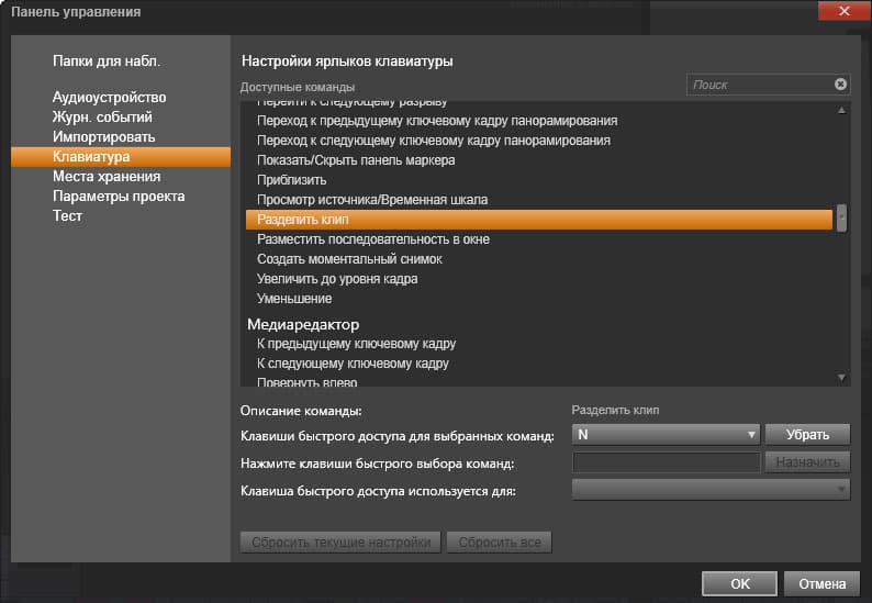 Настройки Pinnacle Studio 17 не блещут широтой: всего несколько пунктов, довольно скупых. Важными являются настройки клавиатурных сочетаний: здесь, как в серьезных старших видеоредакторах, расположена строка текстового поиска, которая позволяет найти нужную команду, лишь впечатав часть слова. Да и сам перечень команд, поддерживающих горячие клавиши, напоминает аналогичный список в профессиональных видеоредакторах.