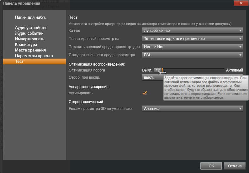 Поначалу мы никак не могли найти способа отключить это автоматическое создание прокси-файлов. Перевод на русский язык некоторых пунктов настроек программы не дает это сделать: очень непросто догадаться, что пункт, управляющий созданием прокси файлов, имеет название Оптимизация порога. Всплывающая подсказка также не несет конкретной информации, кроме общих фраз, написанных языком профессионального пиарщика. И все же опытным путем было установлено, что полностью отключить создание прокси-файлов можно, выставив значение ползунка на 0%. Если значение будет выше — создание файлов предпросмотра возобновится в случаях, когда к проекту будут добавлены переходы или эффекты. Выставить процент еще выше — технология заработает при добавлении титров, и так далее.