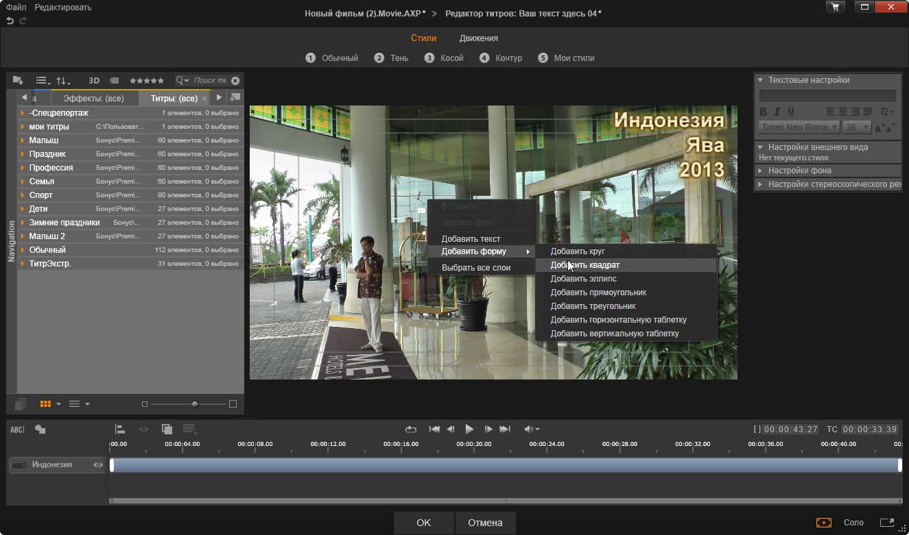 Редактор титров, встроенный в Pinnacle Studio 17, богат инструментами и шаблонами, как анимированными, так и статичными. Важной особенностью этого титровальщика, отличающей его от аналогичных инструментов в других программах монтажа, является представление объектов в виде таймлинии с несколькими слоями. Это фактически программа композитинга в миниатюре. Например, первый слой может представлять собой текст, второй слой — графический объект, анимированный или статичный. Все операции производятся почти так же, как при обычном монтаже на привычной таймлинии.