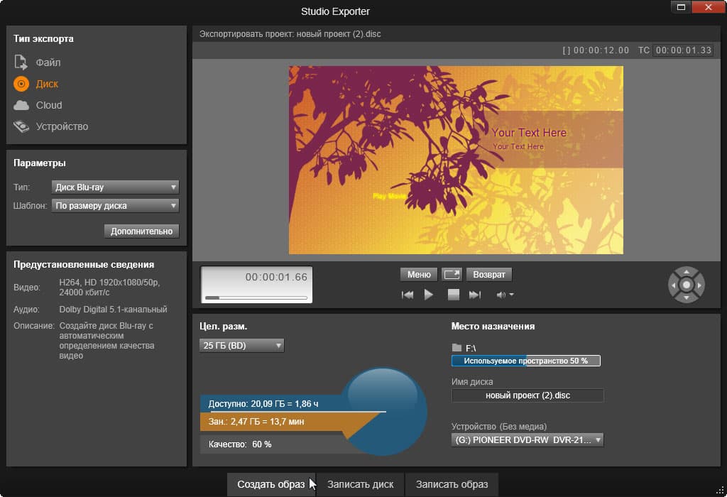 Окончательный «прожиг» диска проводится в отдельном модуле программы, который называется Studio Exporter — он всплывает поверх материнского окна и активен до тех пор, пока идет просчет.
