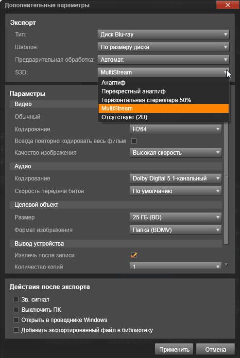 Ура — в данном модуле нашлись дополнительные настройки экспорта, включающие в себя выбор формата, размера кадра, битрейта, частоты кадров и способа представления 3D.
