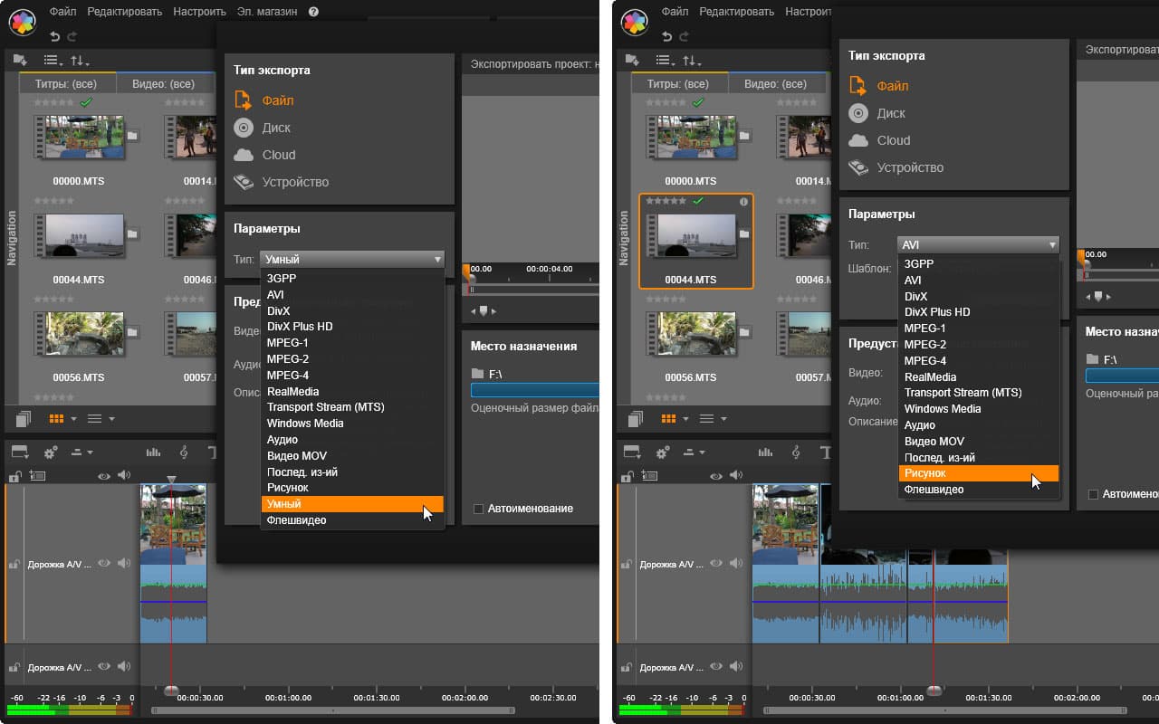 Внимательный зритель наверняка увидел эти отличия: в первом случае список типов файлов содержит пункт под названием «Умный», во втором случае данный список лишен этой умности. При этом в первом случае на таймлинии находится один-единственный видеофайл, тогда как во втором случае этих видеофайлов несколько. Каков вывод?