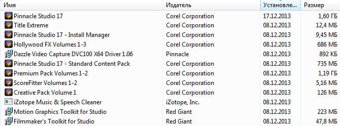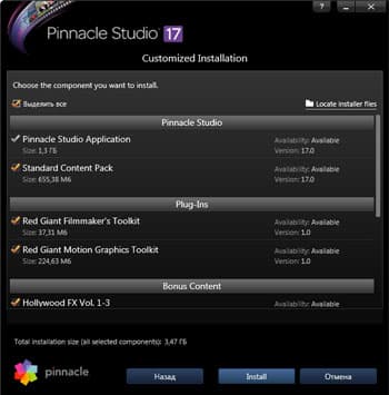 При установке пакета версии 17 Ultimate имеется выбор следующих приложений и дополнений: сама программа, стандартный сборник контента к ней (шаблоны и т. д.), два мощных плагина разработки компании Red Giant, и бонусный пакет, включающий в себя коллекцию анимированных переходов Hollywood FX и прочие плагины и шаблоны.