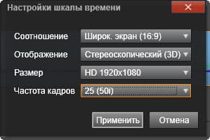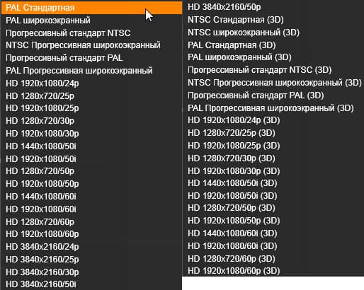Список шаблонов, имеющихся в рассматриваемой программе, нельзя назвать скудным — здесь присутствуют все актуальные сегодня разрешения и частоты кадров, включая и надвигающийся 4K. Отметим также наличие большого количества шаблонов стереоскопических проектов, среди которых, увы, отсутствуют шаблоны полнокадровых стереопар.