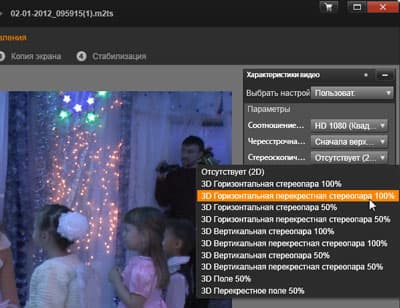 При работе с 3D-материалом программа умеет отображать его несколькими способами, как в окне предпросмотра, так и в полноэкранном режиме. Также программа поддерживает работу с такими технологиями представления 3D, как Nvidia 3D Vision и Nvidia 3D TV Play.