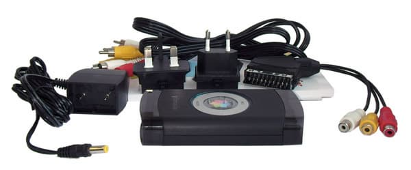 В комплект поставки входит сам аппарат, соединительный кабель с одним видео и двумя аудиоразъемами (тюльпаны), переходник SCART -> Video/Audio Composit, инструкция (хоть и мультиязычная, но русского языка в ней нет) и листовки. Пятивольтовый адаптер снабжен отщелкивающейся вилкой, к нему же прилагается еще одна странного вида вилка (такие используются в электрических сетях некоторых стран). Никаких компакт-дисков не прилагается — ни к чему они, ведь ПК, как мы уже говорили, здесь не нужен.
