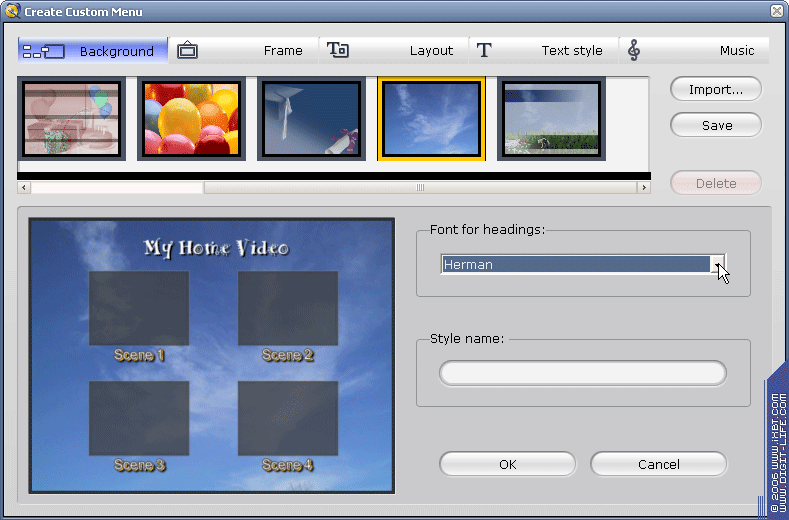 Здесь можно выбрать фон меню (любые распространенные форматы изображений), форму и заливку рамок для будущих кнопок, способ расположения их в меню, стиль текста для заголовков. Заготовок в программе более чем достаточно. Можно подобрать и подходящее музыкальное сопровождение, которое будет проигрываться, пока активно меню. Изменить названия сцен не представляется возможным — изменению поддается лишь заглавное название меню. После создания диска названия сцен будут представлять собой цифры, идущие по порядку. Кириллица поддерживается.