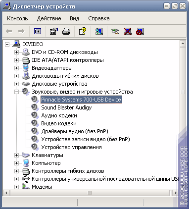 После того, как вы вставите прилагаемый диск №1, драйверы найдутся автоматически. Установка драйверов занимает не более минуты, после чего в диспетчере устройств появляется пункт Pinnacle Systems 700-USB Device, а на корпусе устройства приветливо загорается зеленый светодиод.