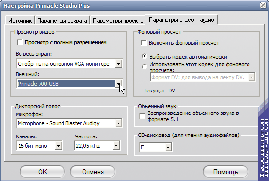 Для того, чтобы видеть на экране телевизора результат работы в Pinnacle Studio Plus, необходимо открыть настройки программы и во вкладке Параметры видео и аудио выбрать из выпадающего списка Pinnacle 700-USB. При этом телевизор нужно подключить к выходам устройства.