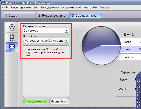 Нельзя также забывать и о необходимости записи готового фильма или его частей на ленту. Любой серьезный видеоредактор имеет такую возможность. Для записи проекта на miniDV кассету всегда используется IEEE 1394, это уже стало привычным. Что же в нашем случае? Как и следовало ожидать, вездесущий USB (действительно — universal) и здесь стал полноценной заменой FireWire.