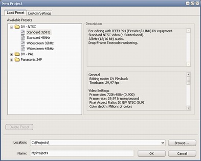 При выборе New Project откроется диалоговое окно нового проекта, где можно выбрать будущий формат создаваемого фильма, метод оцифровки при захвате, количество треков в проекте и многое другое. Все выбранные установки можно изменить в ходе работы над проектом, включая местоположение исходных материалов.