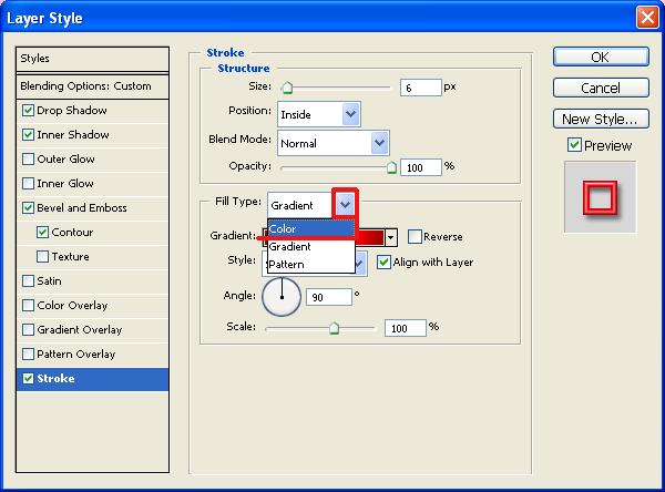 Загрузится окно Layer Style с активированным разделом Stroke. Здесь, в разделе Fill Type выберите пункт Color.