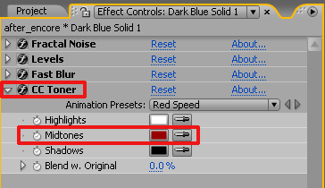 При выделенном слое в палитре Effect Controls откройте закладку эффекта CC Toner и в пункте Midtones нажмите кнопку с пипеткой. Сделайте этой пипеткой щелчок по розовому контуру кнопки в окне композиции.