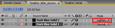Откройте закладку Timeline after_encore на таймлинии, и выделите слой Dark Blue Solid 2.