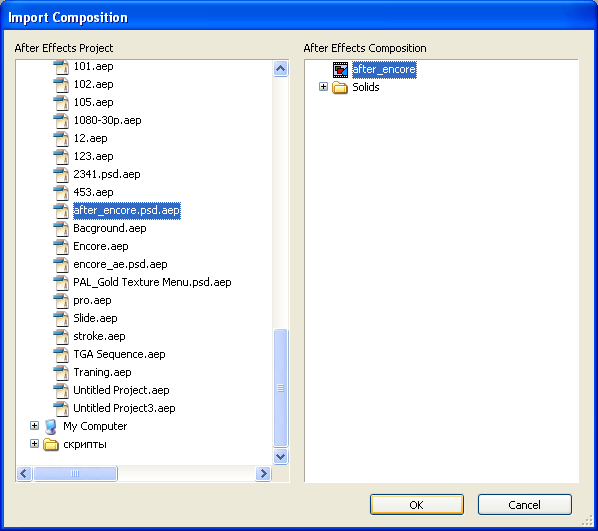 В левом окне Import Composition раздела After Effects Project выберите проект, а в правом окне After Effects Compositions выберите композицию и нажмите кнопку ОК.