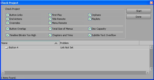 Для проверки проекта на наличие ошибок (желательно на их отсутствие) выполните команду File>Check Project, и в появившемся окне Check Project нажмите кнопку Start. Появится сообщение лишь об одной проблеме: у созданной прозрачной кнопки нет никаких расставленных связей. Но, поскольку так и было задумано, то можно игнорировать данное замечание, нажав кнопку Done.