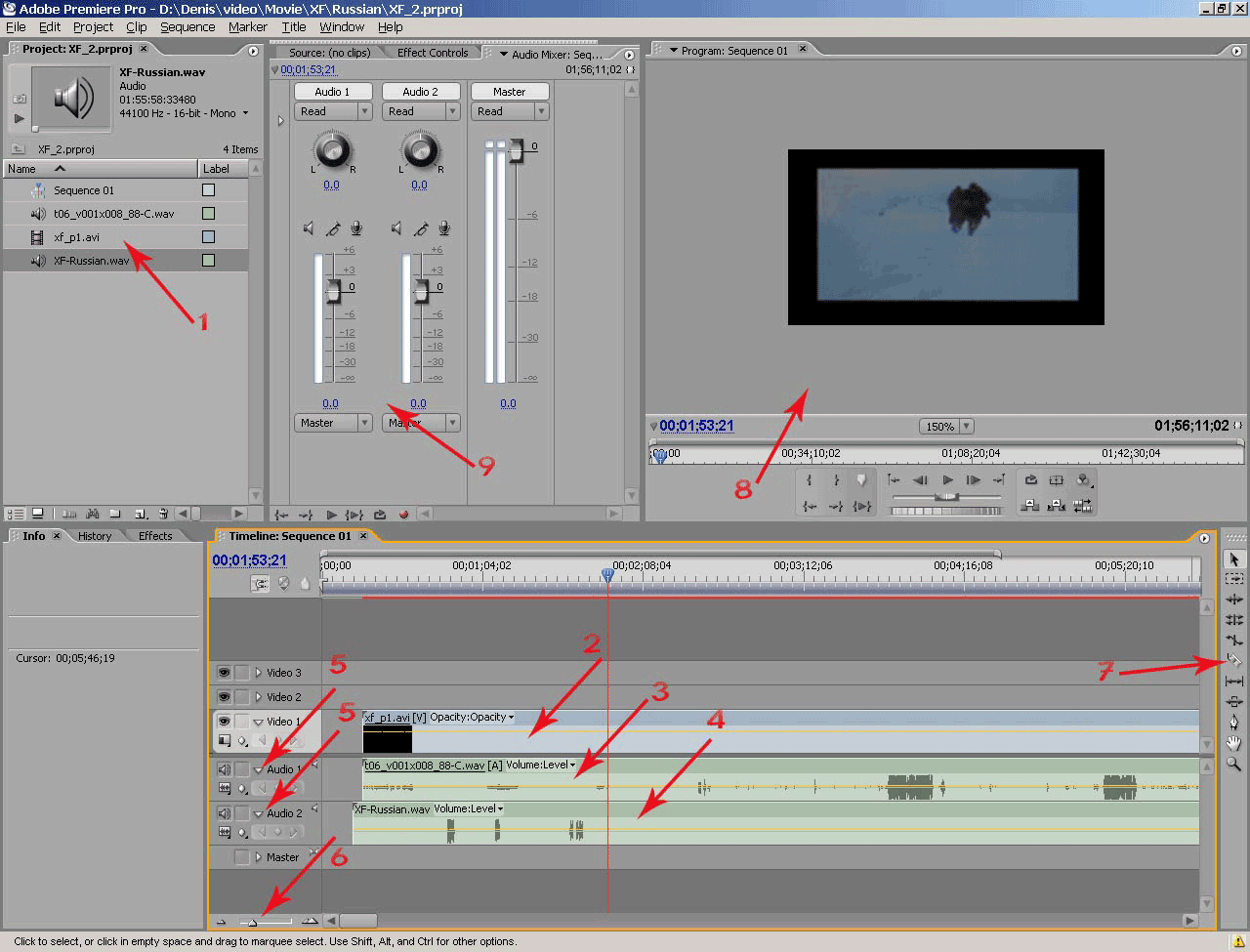 Что же мы получили в итоге? Список файлов, импортированных в проект (рис. 26, п.1), видео и аудио дорожки, размещенные на таймлинии (рис. 26, п.2,3,4). Также ми видим окно монитора (рис. 26, п.8) и окно аудиомикшера (рис. 26, п.9). Это основные рабочие области программы Adobe Premiere (подробнее о работе в программе читайте в статье Adobe Premiere Pro 2.0. Практикум).