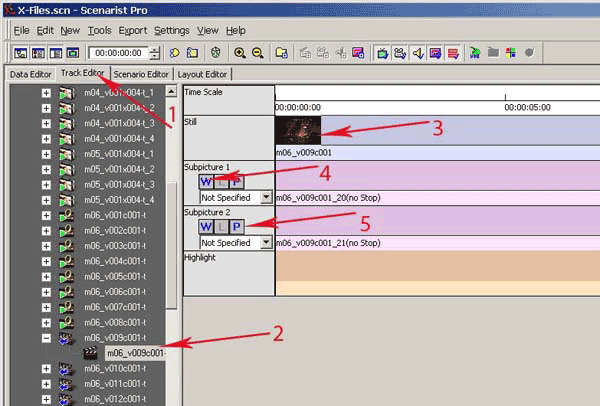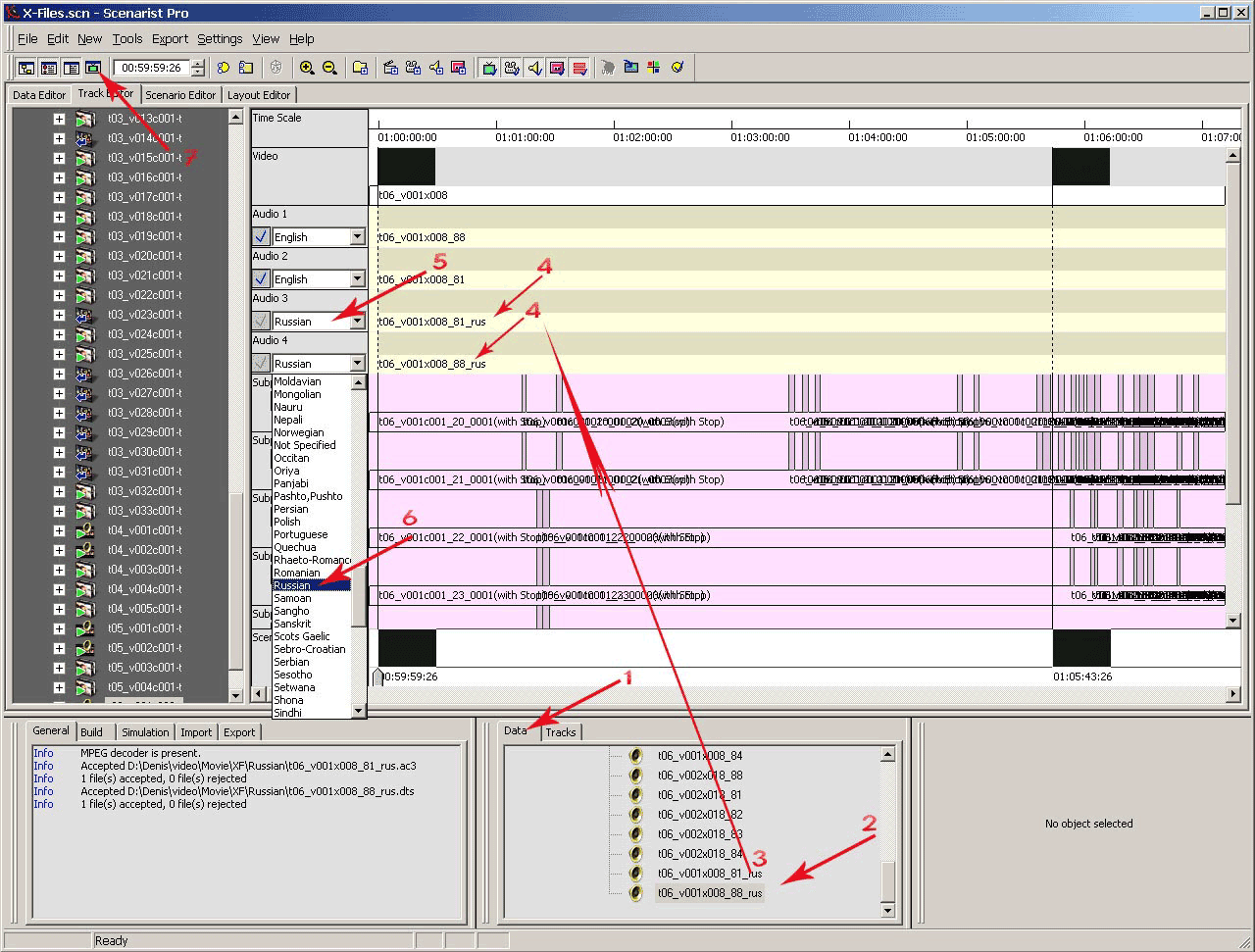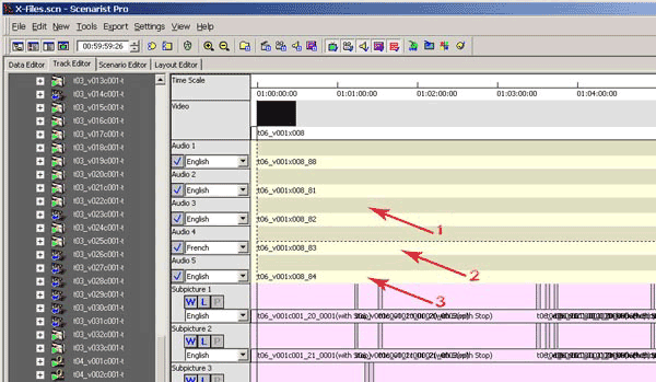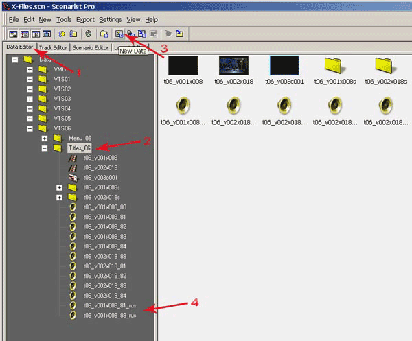Новая аудиодорожка с русским переводом у нас готова, даже две, теперь пора снова вернуться в Scenarist. Запускаем программу или если она была запущена, переключаемся на нее. Перейдите во вкладку Data Editor (рис. 42, п.1). Нам нужно добавить наши новые дорожки в проект.