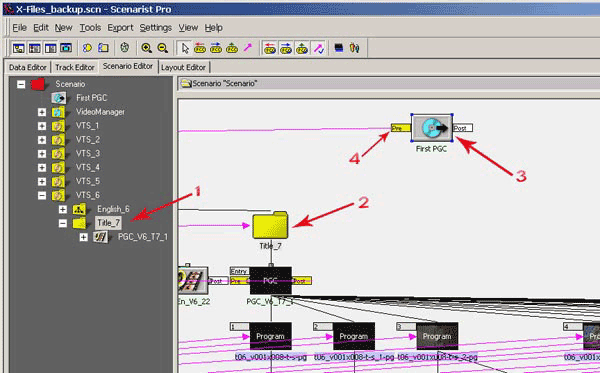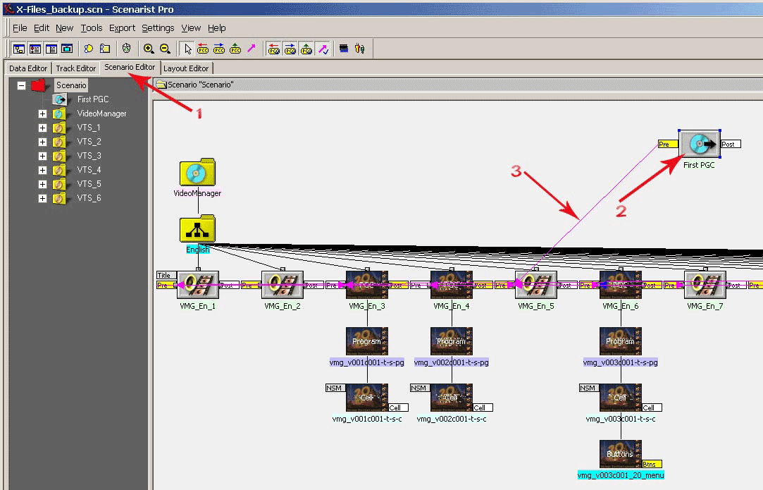 Что касается изменения сценария проигрывания диска, то тут трудно давать какие-то однозначные советы, так как все диски разные, и у каждого могут быть свои собственные требования к конечному результату. Поэтому мы рассмотрим совсем простой пример изменения сценария, а все остальные возможные доработки оставим на ваше усмотрение. Давайте сделаем, чтобы при старте воспроизведения диска сразу начинался фильм и при этом автоматически включалась русская аудиодорожка, которую мы с вами добавили. Щелкните мышкой на вкладке Scenario Editor (рис. 47, п.1). Проигрывание DVD-Video диска всегда начинается с программной цепочки First PGC (рис. 47, п.2). В нашем случае PGC связан с доменом VMG (рис. 47, п.3), в котором находятся вступительные заставки. После этого, если рассмотреть схему сценария, следуют связи со вступительными роликами и далее на главное меню диска. Давайте всю эту схему обойдем, то есть, сделаем связь домена First PGC с таймлинией, на которой размещен фильм.