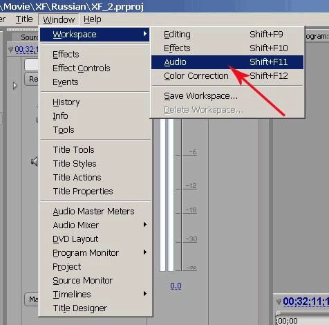 Поскольку основная наша работа касается аудиодорожки, то станет удобнее, если мы изменим рабочее пространство, активировав предустановку Premiere — Audio.