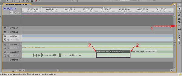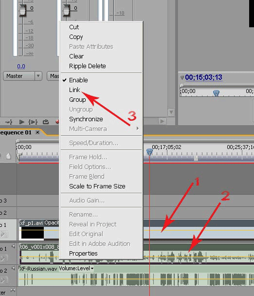 Щелкните мышкой на кнопке expand/collapse track, чтобы развернуть аудиодорожку (рис. 26, п.5). С помощью ползунка (рис. 26, п.6) настройте масштаб таймлинии. Чтобы было удобнее перемещать видео и аудиодорожку относительно перевода фильма, давайте их объединим в целях синхронного перемещения обеих дорожек по таймлинии. Удерживая клавишу Shift, выделите мышкой видео и аудио дорожки фильма (рис.27, п.1-2), затем щелкните правой клавишей мышки. Выберите команду Link (рис. 27, п.3). Дорожки объединятся в единое целое.