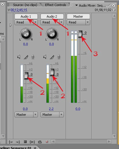Следующее, что нужно сделать, это выровнять громкость аудиодорожек, если одна из них звучит громче другой. Сделать это можно с помощью микшера программы Premiere (рис. 29). В окне микшера вы можете отрегулировать параметры как отдельно для каждой аудиодорожки (рис. 29. п1), так и общее звучание в целом. Включите в окне монитора воспроизведение и в окне микшера смотрите, чтобы по возможности не было перегрузок, то есть, чтобы индикатор уровня звука не выходил в "красную" область, и уровень дорожек был примерно одинаков. Отрегулировать уровни можно ползунками регулировки (рис. 29. п.2, 3).