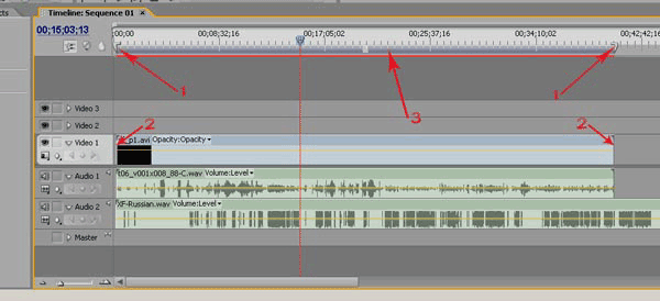 После этого нажмите клавишу Del. Дорожка удалится. Чтобы на дорожке Audio 4 удалить содержимое, но не удалять саму дорожку, мышкой выделите на ней светлую область (рис. 43, п.2), и снова нажмите клавишу Del. Удалится содержимое этой дорожки, но сама дорожка останется на таймлинии. То же самое проделайте и с дорожкой Audio 5 (рис. 43, п.2). То, что у нас получится, можно увидеть на рисунке: