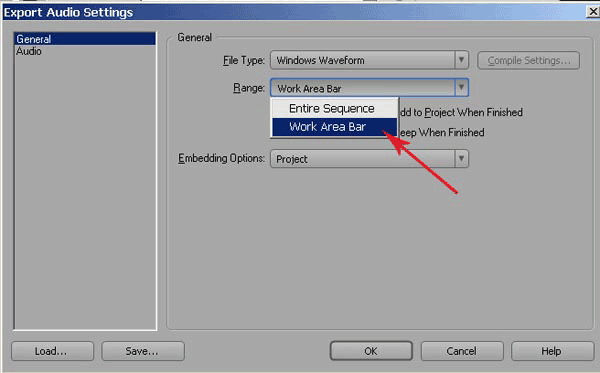 В выпадающем списке Range вкладки General, выберите параметр Work Area Bar и перейдите на вкладку Audio.