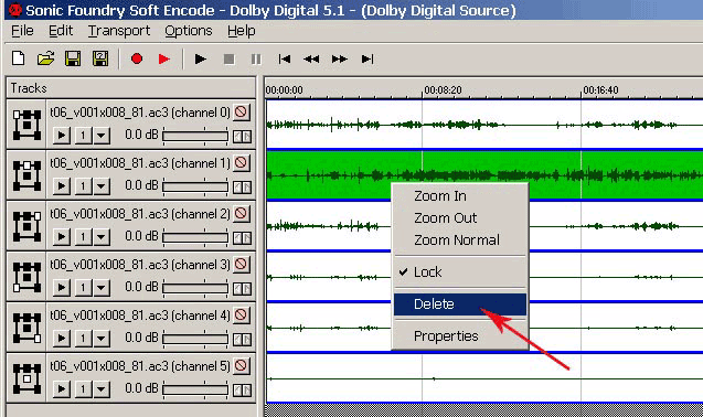 Теперь нам нужно, используя новую дорожку центрального канала с русским переводом, создать AC3 файл. Переключитесь на программу Sonic Foundry Soft Encode, если вы ее не закрыли, а если закрыли, то откройте в ней тот самый AC3 файл, который мы использовали для получения WAV файла центрального канала. Выделите центральный канал, нажмите правую кнопу мышки и выберите команду Delete.