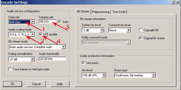 Выставляем битрейт кодирования (оптимальный вариант — 448 kbps ) (рис. 38, п.1); указываем количество дорожек (рис. 38, п.2) — в нашем случае 3/2; определяем Sample Rate, в нашем случае 48 kHz (рис. 38, п.3); отмечаем флажком пункт LFE enable (тем самым подтверждаем наличие у нас этого канала) (рис. 38, п.4). Остальные параметры оставляем без изменений. Нажимаем кнопку OK. Возвращаемся в главное окно программы и нажимаем кнопку Encode.