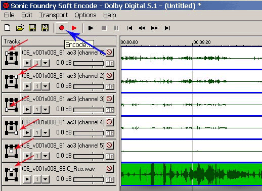 Начинается процесс кодирования AC3 файла. Если вы разбирали AC3 файл с помощью BeSweet, то вам нужно добавить не только центральный канал, но и все остальные каналы. В этом случае вам нужно правильно расставить пиктограммы каналов AC3 файла. На рис. 39 они указаны красными стрелками.