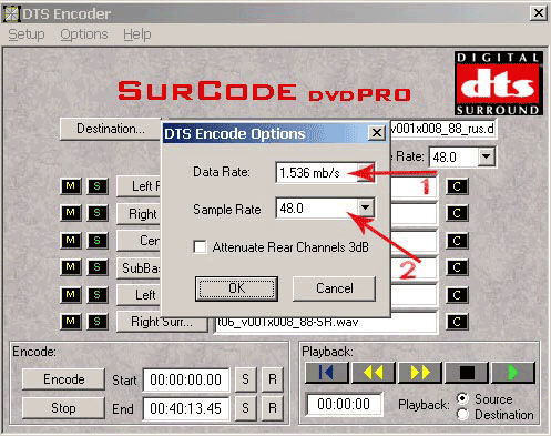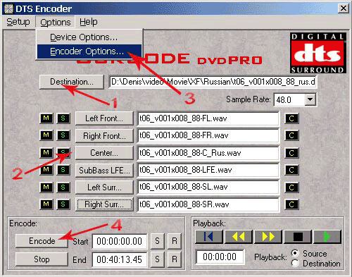 Указываем bitrate кодирования (рис. 41, п.1) и Sample Rate (рис. 41, п.2), нажимаем кнопку ОК. Возвращаемся в главное окно программы. Все настройки завершены, нажимаем кнопку Encode (рис. 40, п.4), начинается процесс кодирования. По окончании работы программы мы получим новый DTS файл с русским переводом.