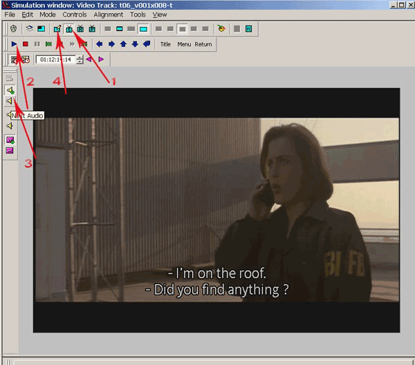 Нажимаем кнопку Software Emulation на панели инструментов окна симуляции (рис. 46. п.1), далее нажимаем кнопку Play (рис. 46. п.2). Начнется воспросизведение фильма. Чтобы переключить аудиодорожки, нажимайте кнопу Next Audio (рис. 46. п.3). Нажимайте несколько раз, и, когда дойдете до дорожки Audio 3, то услышите, что звучит наша дорожка с наложенным переводом. Одно маленькое замечание: Scenarist не умеет проигрывать аудиодорожки формата DTS, то есть, если вы переключитесь на такую дорожку кнопкой Next Audio ( в нашем случае Audio 4), то вы ничего не услышите. Дорожки AC3 воспроизводятся нормально.