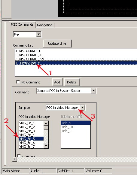 В данном случае нам предстоит разобраться с командами DVD-Video. Работа с ними осуществляется в окне симуляции. Обратите внимание на команду JumpSS pgc 5 (рис. 49, п.1), которая выполняется последней после нескольких команд Mov. Это и есть команда перехода, которую выполняет плеер, а куда он должен перейти — описывается в нижней части окна Command. В свойствах команды Jump стоит параметр Jump to PGC in Video Manager (рис. 49, п.3) и параметр VMG_En_5 (рис. 49, п.2). Именно на этот VMG DVD плеер передаст управление при выполнении данной команды. Делаем вывод: если мы хотим изменить порядок воспроизведения при старте диска, то нам нужно изменить эту команду. Команду можно изменить двумя способами — прямо здесь, в окне Simulation, а также в окне Scenario Editor методом Drag&Drop. Давайте используем второй способ, а после увидим, как изменилась команда флага Pre после наших действий.