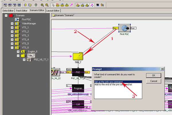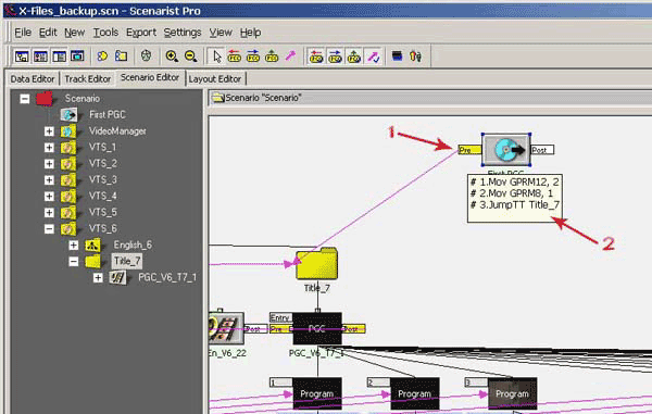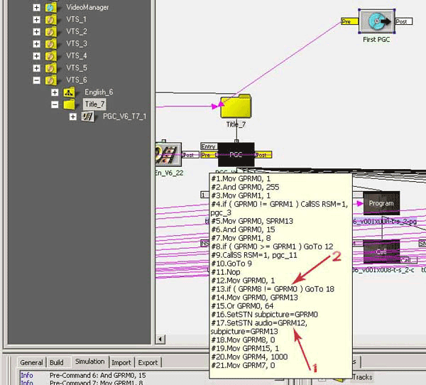 Откроем в дереве данных сценария (рис. 48, п1) папку VTS_6, в ней мы увидим две подпапки: English_6, содержащая меню данного VTS, и Title_7, в которой как раз и находится видеодорожка с фильмом. Щелкнем мышкой на этой папке и справа, в окне редактирования сценария, сразу станет активным Title_7 (рис. 48, п.2). Также для удобства работы перетащим иконку First PGC поближе к иконке Title_7 (рис. 48, п.3). Теперь рассмотрим, как же выполняется команда перехода DVD плеером, которая на схеме сценария отображается связью между объектами (рис 47, п3). Щелкните два раза на флажке Pre домена First PGC (рис. 48, п.3), перед вами откроется уже знакомое окно симуляции: