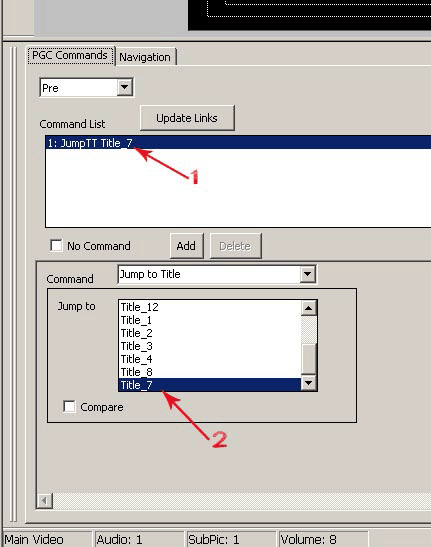 Результат вполне ожидаем: команда JumpSS pgc 5 сменилась командой JumpTT Title_7 (рис. 51, п.1), что означает Jump to Title 7 (рис. 51, п.2). Проверить результат можно, запустив воспроизведение сценария диска в Simulation Window, как мы это делали раньше (рис. 46).