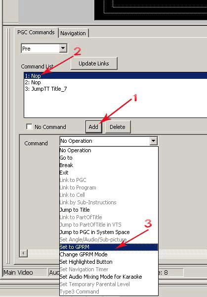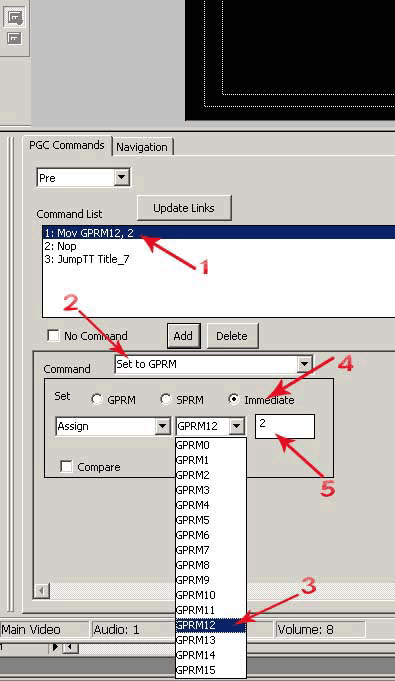 Обратите внимание, что эта команда уже используется, и значение для нее берется из регистра общего назначения GPRM12, в списке находится команда SetSTN audio=GPRM12. То есть, если мы поместим в этот регистр необходимое нам значение, то перед тем, как плеер проиграет Title 7, он установит активной аудио дорожку, значение которой мы поместим в регистр GPRM12.