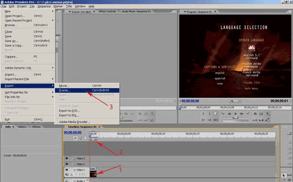 Импортируем файл m06_v009c001.m2v в проект Adobe Premiere и помещаем его на таймлинию (рис 59. п.1). Обратите внимание, что он действительно имеет длительность всего один кадр (рис 59. п.2). После этого выполняем команду File->Export->Frame (рис. 59. п.3) и сохраняем этот один кадр в формат BMP, с которым мы уже можем работать в Photoshop. Подробности обработки фоновой заставки меню в Photoshop мы описывать не будем, тут предлагается применить свою фантазию и умение работать с этим графическим пакетом, положившись на свой вкус. Если коротко, то, используя инструменты Clone Stamp и Healing Brush Tool, мы стерли старые надписи и с помощью Text Tool создали новые. Что касается субкартинок, то их мы тоже изменили, тут самое главное, что все изменения нужно делать точно таким же цветом, которым нарисованы сами субкартинки. Чтобы точно выбрать цвет, можно использовать инструмент Eyedropper Tool. Вот что в итоге получилось: