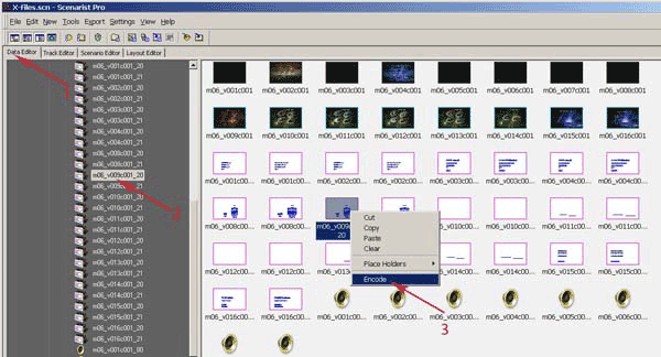 Теперь возвращаемся в Scenarist. Для того, чтобы изменения вступили в силу, нужно проделать некоторые действия. Переходим на вкладку Data Editor (Рис.61, п.1), в списке файлов находим два наших файла с субкартинками (Рис. 61, п.2), выделим один из файлов, щелкнем на нем правой кнопкой мышки и выполним команду Encode (Рис. 61, п.3). То же самое проделаем и со вторым файлом. Теперь все изменения вступили в силу, можно проверить, что у нас получилось.